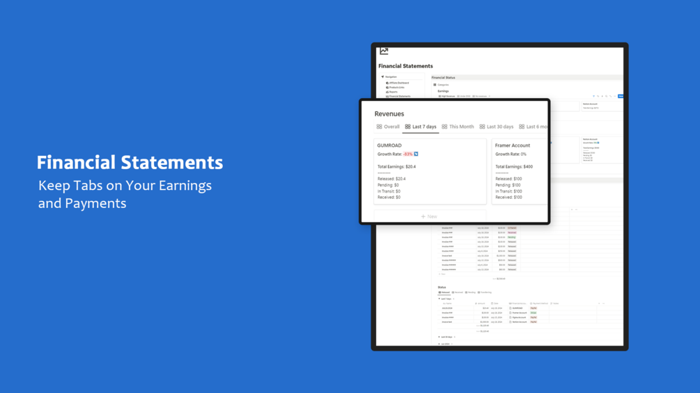 - Financial Accounts: Monitor your financial accounts with detailed reports on transactions, status, and growth rates. Stay on top of your earnings and financial health.