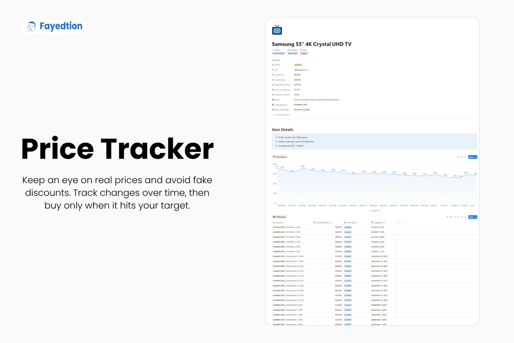 Log price history, set a target price, and buy only when it hits. Make clear decisions, stay in budget, and avoid regret.
