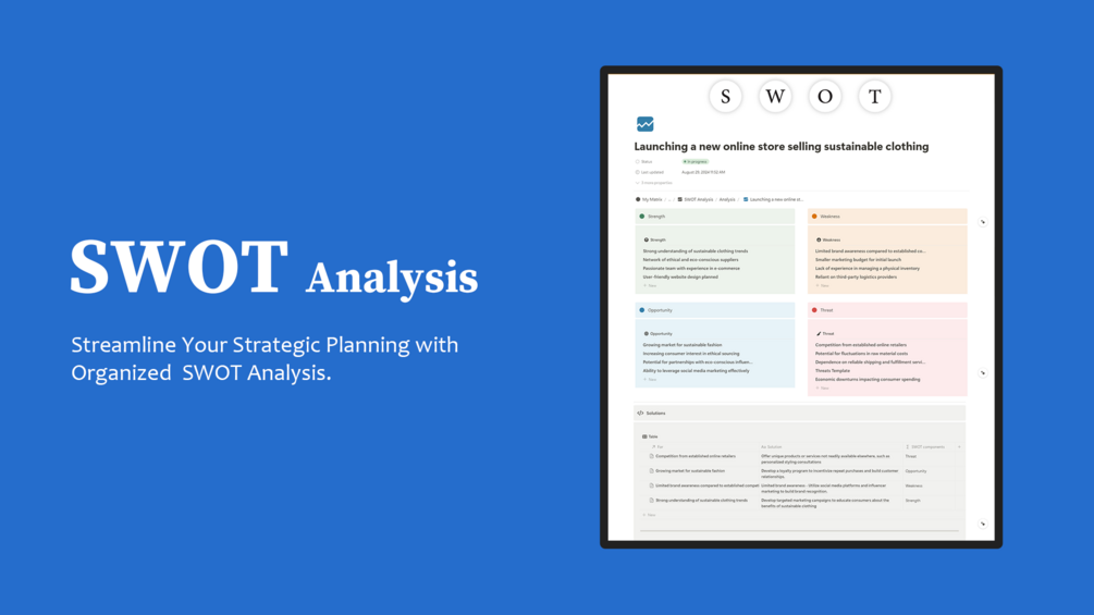 - Develop Solutions: Craft solutions and strategies to address each SWOT point in the Analysis Results database.