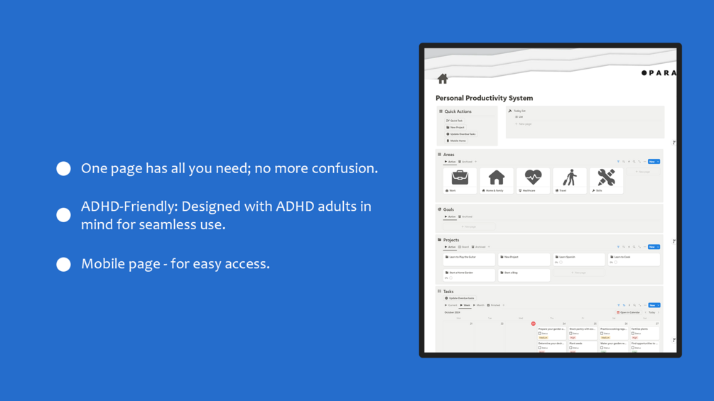 The Personal Productivity System is more than just a digital planner; it’s your roadmap to success. Whether you're a busy professional, student, or someone with ADHD seeking organization, this template provides the structure you need to stay on top of it all.